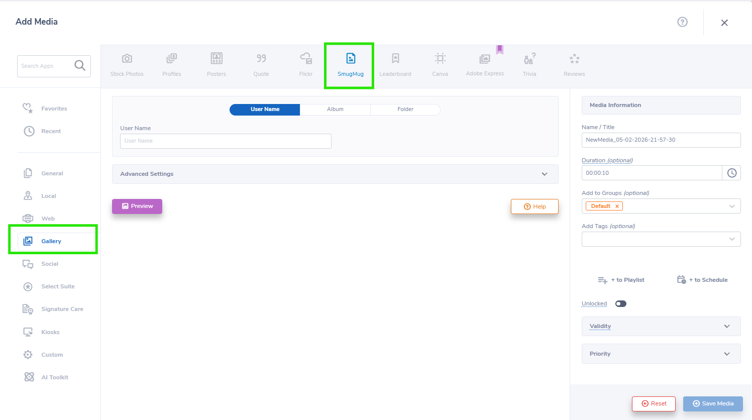 Note: SmugMug Gallery Settings must be set to Public (Anyone). This can be done by going to the SmugMug website, then Settings > Security and sharing> Visibility Public (Anyone) and Security and sharing> Access> Anyone. These settings must be applied in order to use the SmugMug Gallery Content App in Mvix CMS.
