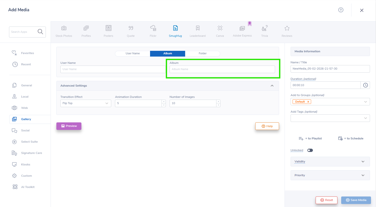- Additionally, clients have the option to display Albums or Folders from SmugMug. If you would like to display an album, enter the album's name in the "ALBUM' field. This will pull data from that specific album.