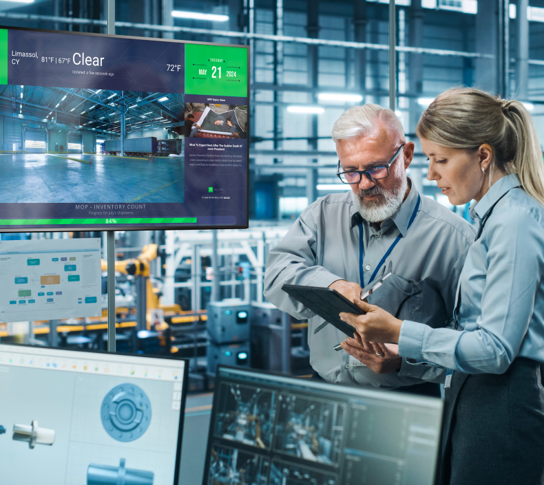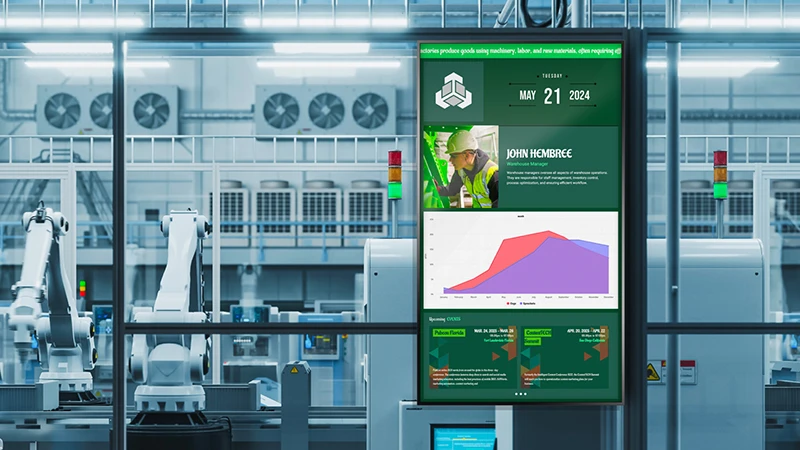 Digital signage solves these problems by delivering dynamic, visual updates directly where employees are working. Instead of relying on email or bulletin boards, you can push important messages to every display in the facility instantly.