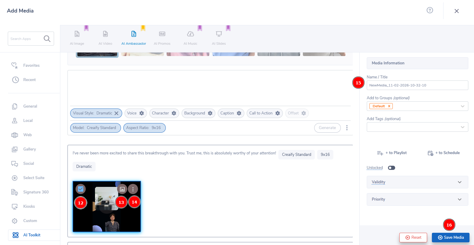 - If everything is good, make sure the video checkbox is selected, (15) Name/Title your media something easy to reference, and click (16) "Save Media" to save this to your CMS Media Library.