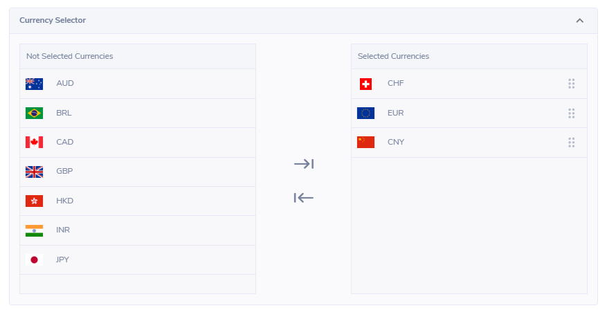 - Choose the currency(ies) that can be brought and sold for your template. When you click, the currency on the left will appear on the right under "SELECTED CURRENCIES". Please note that all currency conversion is in USD.