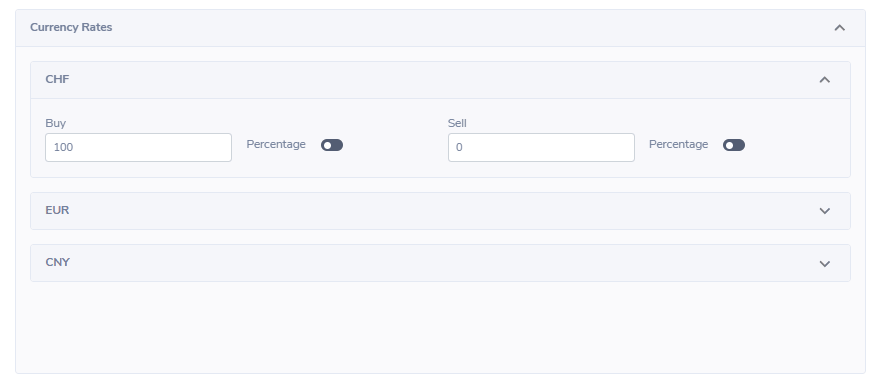 - Adjust the currency rates as necessary under "CURRENCY RATES". Enter the buy and sell amounts for the currency selected. For example, AUD = Australian Dollar, CAD = Canadian Dollar, and BRL = Brazilian Real. You will enter the buy and sell amounts for each currency that was selected. Switch the toggle to green if it is a percentage.